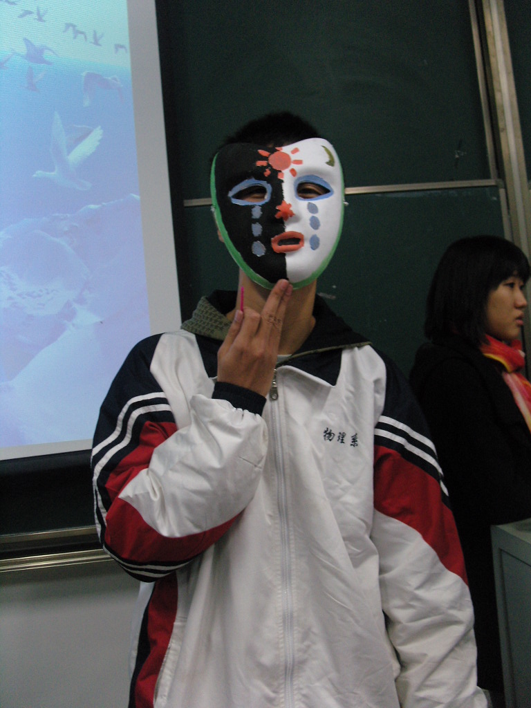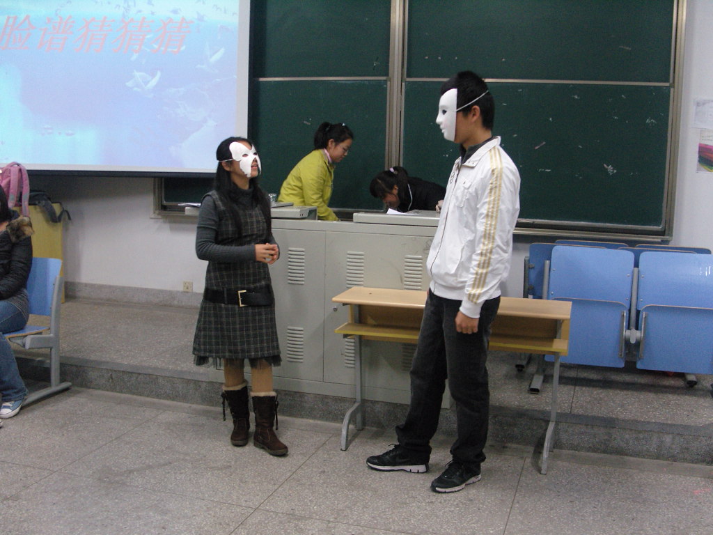 脸谱散发着东方美术的迷人气息,其背后承载着的是一个个饱满的故事,而面具为西方玩物,多出没于交谊、沙龙场所。于是狡黠又狡黠的主办方融合起东西方的特色,又在空白面具的背面写上那些戏剧中神仙眷侣的佳名。这为下面的活动埋下了伏笔。获得成品面具的同学要根据面具后的名字找到另一半,然后玩双人游戏。双人互动游戏包括脑筋急转弯、细辨真假、夹气球、用努嘴的方式夹着传纸牌等等。这样男女搭配,打破了男生女生之间的陌生感和羞涩,而正是在此种热烈的氛围中,活动达到了高潮。
