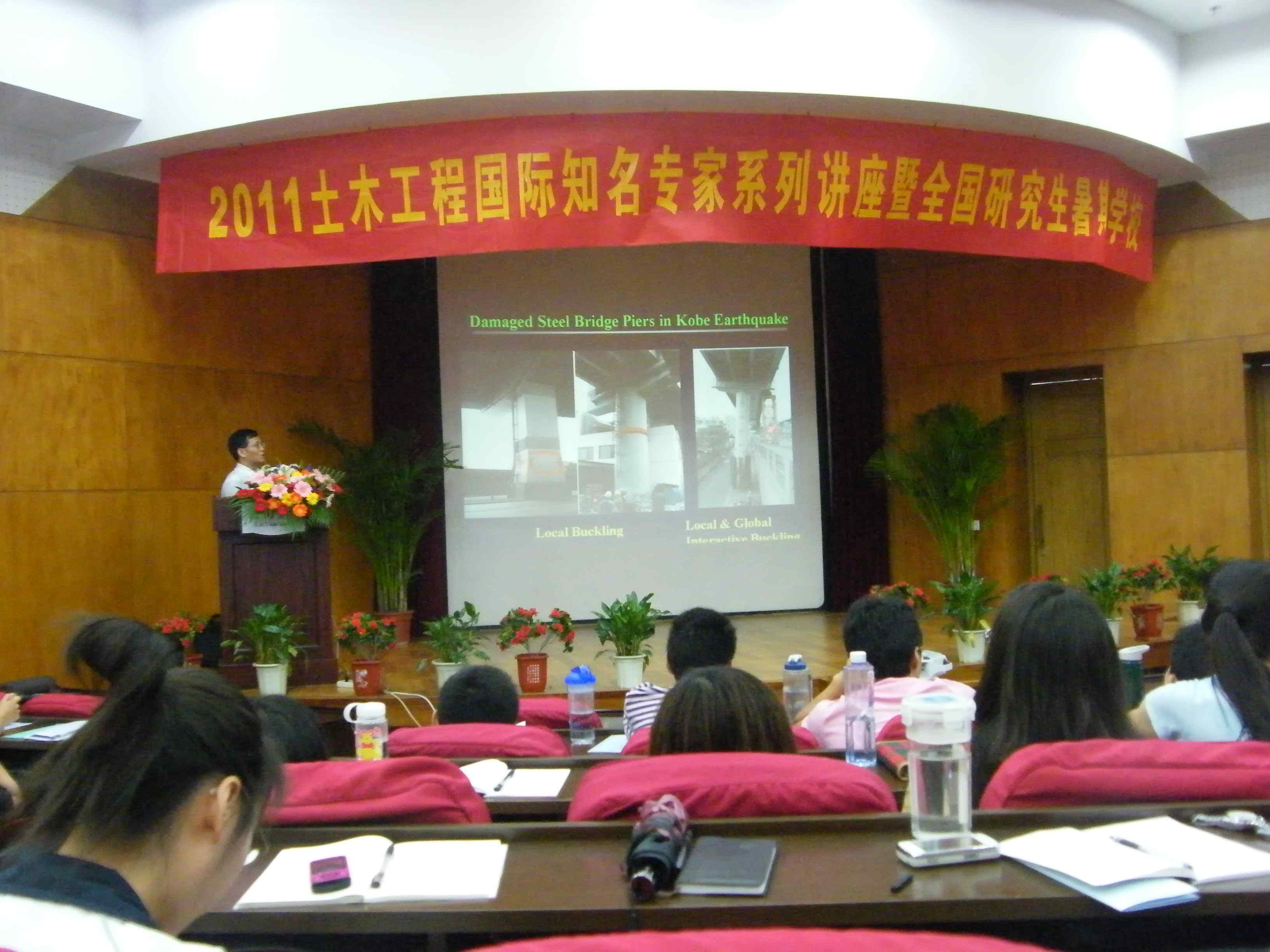 讲座于9:00正式开始。首先由葛汉彬教授做本次暑期学校的第一场题为“日本钢结构抗震和损伤控制设计的研究进展”的精彩学术讲座。葛教授从结构工程的热点研究课题出发,回顾了结构工程的发展史,提出了结构工程领域当前面临的诸多挑战,重点讲述了薄壁钢结构在日本广泛应用的原因和地震作用下结构破坏的类型以及震后的修复及加固方法,并根据试验和数值分析评估结构抗震性能,最后介绍了钢桥结构抗震设计的最新进展。讲座结束已经过了12点钟,但同学们还在积极地提问,葛教授也耐心地解答,气氛甚为热烈。