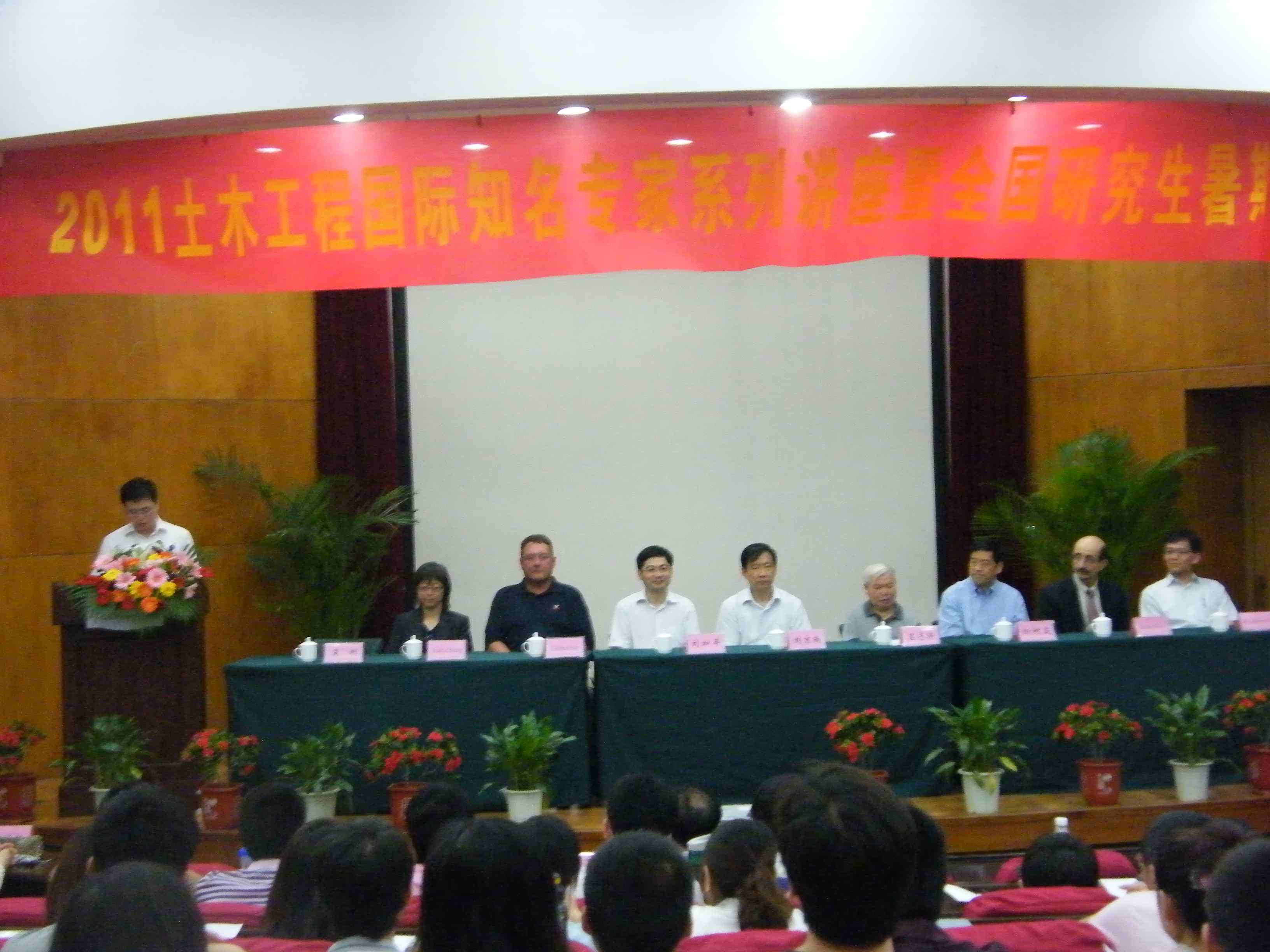 2011年土木工程国际知名专家系列讲座暨全国研究生暑期学校于7月5号上午8:30在3522vip浦京集团官网逸夫科技馆报告厅正式开学。3522vip浦京集团官网刘京南副书记、中国工程院吕志涛院士、江苏省建科院刘加平总经理、美国北卡州立大学Evans教授、美国加州州立理工大学NOORI教授、美国加利福尼亚大学洛杉矶分校张简教授、日本名城大学葛汉彬教授、国际合作处史兰新处长、研究生院研工部归柯庭部长以及3522vip浦京集团官网吴刚院长、张星书记、叶继红副院长、陈镭副书记兼副院长等出席了开幕式。