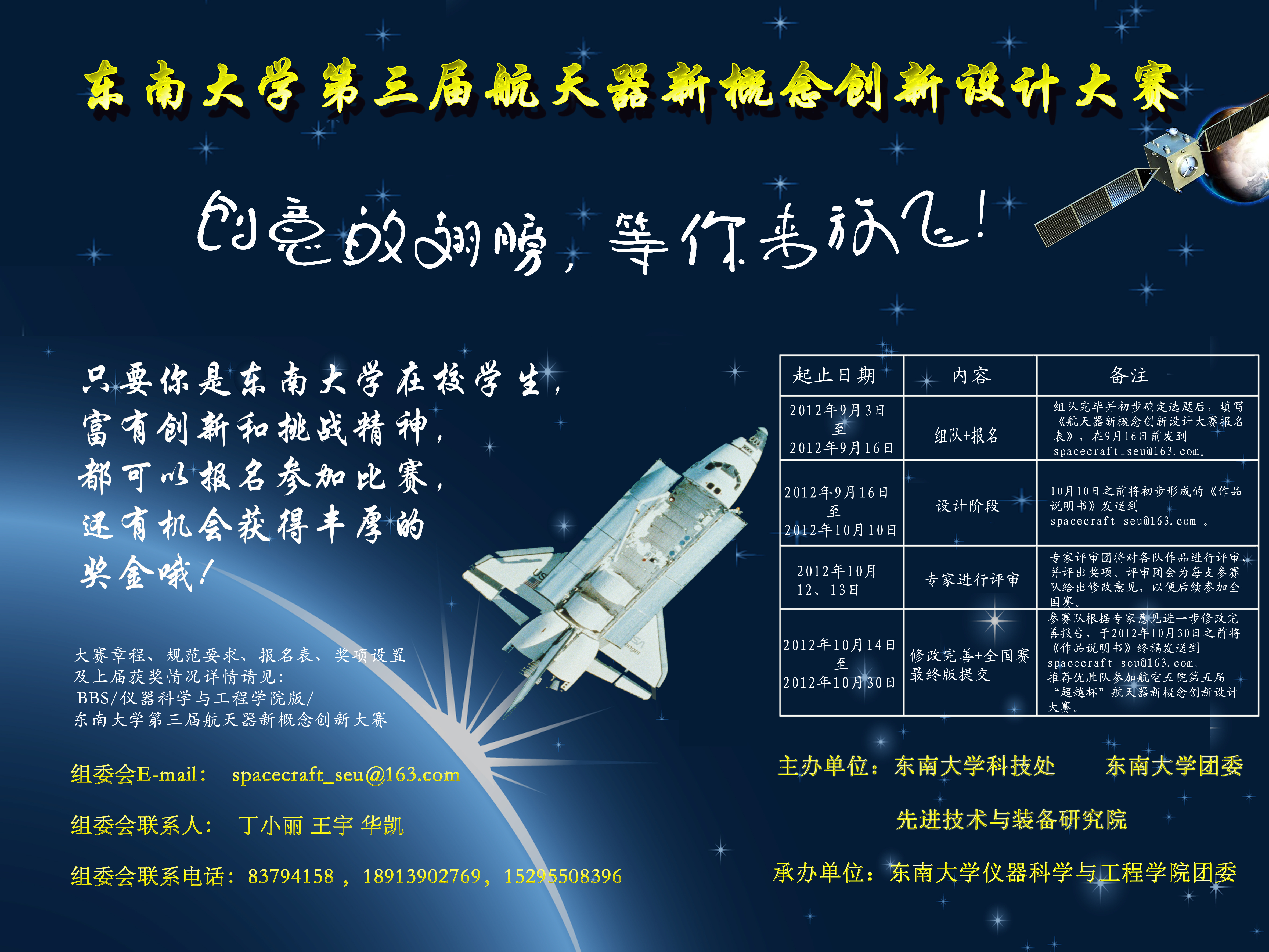 中国空间技术研究院总体部第五届“超越杯”航天器新概念创新设计大赛即将开始,为选拔优秀作品参加高水平的竞赛,现决定于2012年9、10月举行3522vip浦京集团官网第三届航天器新概念创新设计大赛。在之前两届的比赛中,我校同学取得了丰厚的成果,连续两年获得此项比赛全国一等奖,并获得了多项二三等奖。