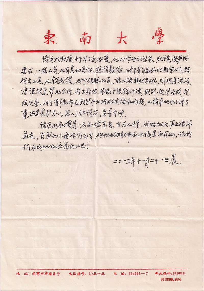 编者按:诸关炯教授在患病住院6个月后于2013年11月21日早晨与世长辞,享年82岁。第一时间闻此噩耗的单炳梓教授深感悲痛,挥笔写下了这篇怀念文章。 诸老师和单老师退休后同被聘为校教学督导组专家,共同在教学督导组工作了18年。对学校、对学尤其对青年教师共同的爱,使他们结下了深厚的友谊。在诸老师住院期间,到医院探视次数最多的老同事就是单老师。尽管对诸老师的病情很了解,但当闻此噩耗,单老师还是非常悲痛,所以,挥笔写下了这篇思念的文章。 诸老师在健康时就与老伴约定百年之后不出讣告、不设灵堂、不开举行官方的告别式,所以,单老师挥笔写下了这篇纪念文章。 现将单炳梓教授的这篇短文贴于此,借此表达我们对诸关炯教授沉沉的怀念和深深的敬意。 |