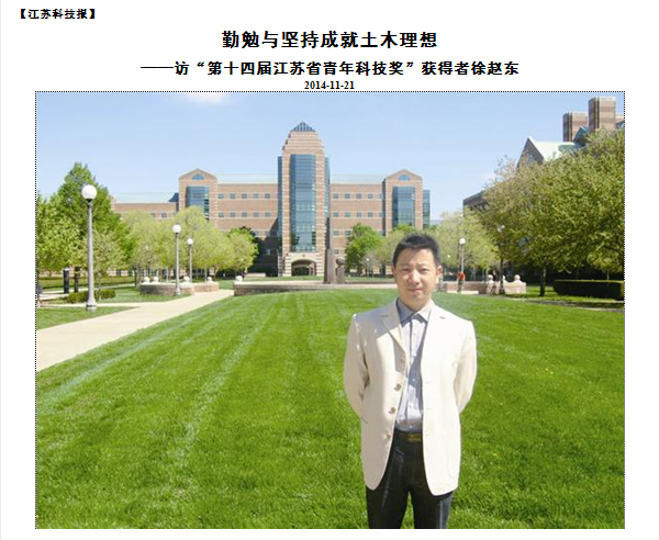 勤勉奋进 浇灌硕果 地震和强风是土木结构动力灾变的主要原因,因强烈振动致使土木结构破坏,并导致巨大的经济财产损失,甚至危害人民生命安全。徐赵东就是致力于研究如何提高高层建筑或者大跨桥梁这种土木结构的抗地震、抗强风振、抗倒塌的能力。在这个领域他付出了大量心血,也做出了很多贡献。 徐赵东研发的高耗散粘弹性材料及装置成功应用于8项土木工程、1000多公里长的大跨输电线、十余万台工程机械和设备基础减振中;研发的磁流变液成功应用于两项大跨桥梁智能减振中,累计取得直接经济效益超2亿元。针对空间微振动(卫星)和机载激光平台分别研制了防挥发微振粘弹性减振器和大阻尼宽频隔减振装置,已进行了系列初装试验。 青年才俊,却已硕果累累,谈起成功的秘诀,他说:“勤奋永远都是第一位的,永远都是不变的成功秘诀。”