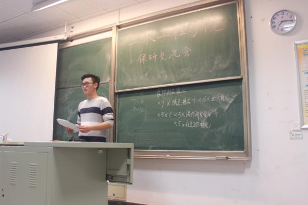 在交流会的第一部分,六位学长详细地为我们阐述了保研的相关事宜。首先上台的是林煜学长,他将保研的整个过程分成了三个阶段,让大家对保研准备的内容和时间有了整体的把握,提醒大家要关注保研政策的发布和调整;接下来是顾大伟学长,他主要为我们说明了保研名额的确定方法,并根据自身经验抓住一些重点进行强调;除了绩点之外,面试是组成保研成绩的重要部分,相关事宜臧芃乔学长为我们进行了周详的说明,包括面试前的准备工作、面试评选机构以及面试的技巧与内容;韩磊学长作为外校的推免生,他为有意保研外校的同学阐述了推免系统的运作以及相关的注意事项;工程管理专业的代表是周圣华学长,他在怎样选择导师、如何联系导师的问题上分享了自己的经验,对工管和其它专业的同学们都有指导性的意义;最后上台的是工程力学专业的徐向阳学长,工力专业的保研方向是比较广泛的,他欢迎相关专业的同学进行有针对性的咨询。