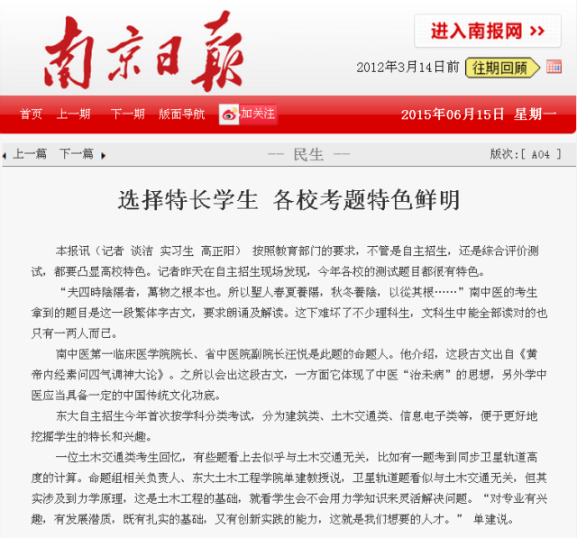 【编者按】今年自主招生的做法与往年相比有很大的变化,如招生高校的考核改在高考之后,成绩公布之前进行;考核工作由招生学校的各个学科自己负责。这样做的一个重要目的就是突出学科特色,注重考核考生的专业方面特长。新闻媒体对此特别关注,在我校自主招生考试笔试开始后,就有多家媒体对土木交通类自主招生笔试命题负责人单建教授进行了采访,南京日报就是其中之一。 |