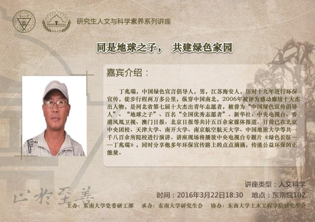 3月22日晚18:30,环保公益主题讲座 “同是地球之子,共建绿色家园”在四牌楼校区东南院102室开讲。主讲人是中国绿色宣言倡导人,丁兆瑞先生。