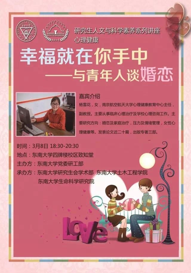 3月8日晚18:30,婚恋心理主题讲座 “幸福就在你手中——与青年人谈婚恋”在四牌楼校区致知堂开讲,主讲人是来自南京航空航天大学心理健康教育中心主任,杨雪花副教授。