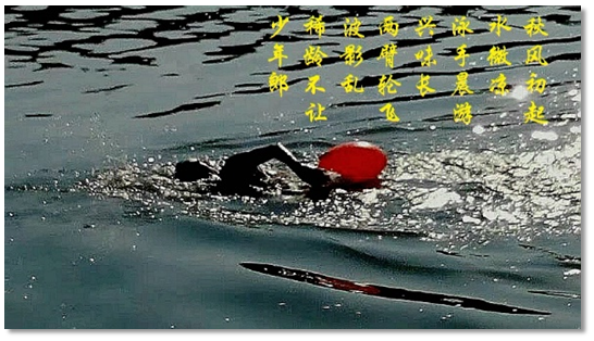 【编者按】8月下旬,秋风乍起,暑气渐消,单建老师因高温而拖延的泰州之行终于付诸实施。回到家乡的第二天,单老师和他的连襟一起去东城河(现在有了高大上的新名字:凤城河)游泳。从那天起直到回南京前,整整一周的时间里,单老师一天不落,每天游泳1000余米。单建老师的夫人也抽出时间,带着手机,为他们拍照,给此次行程留下了印记。单老师看到照片后觉得,虽然比不上单反相机的清晰度,但有几张也很传神。因此单老师一时有了诗兴,写了几首题在照片上。现选择其中两张,与爱好游泳的朋友们分享。