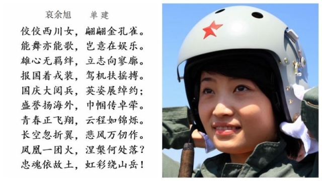 【编者按】2016年11月12日,空军歼-10女飞行员余旭,在飞行训练中不幸牺牲。浦京集团官网单建教授说,他获此消息后的这几天一直放不下,今天赋诗一首表示痛惜,才多少了却一段心愿。