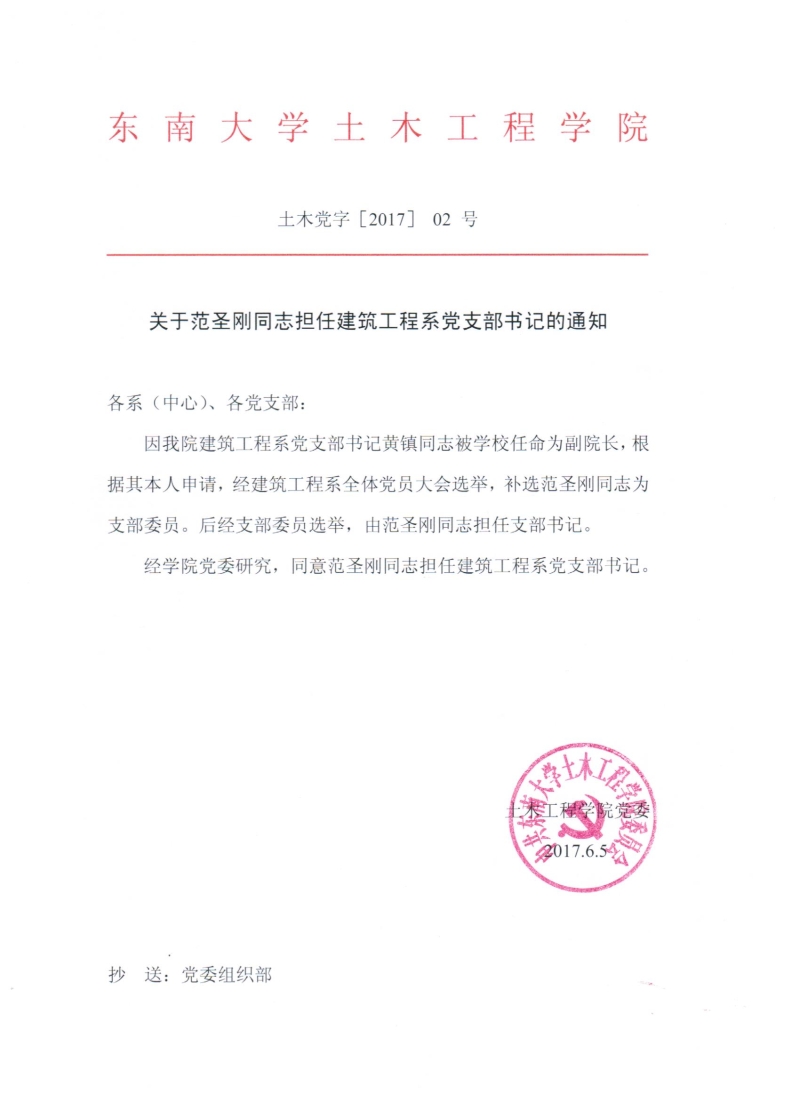 关于范圣刚同志担任建筑工程系党支部书记的通知