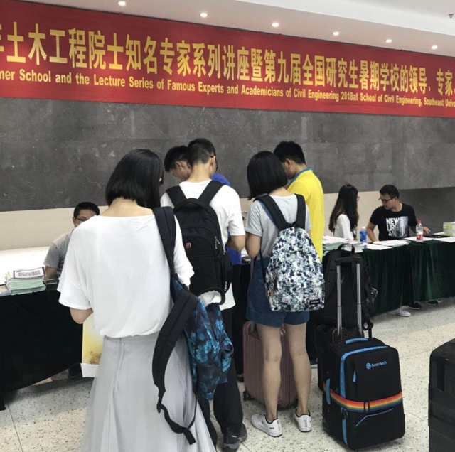 6月30日下午,2018年土木工程院士知名专家系列讲座暨第九届全国研究生暑期学校报到工作在3522vip浦京集团官网九龙湖校区新土木大楼一楼大厅有序进行。来自全国众多高校的优秀学子在志愿者引导下完成注册,并领取了讲座资料。