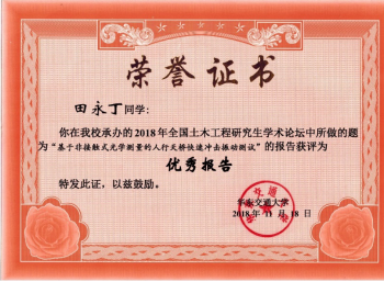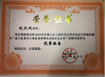 2018年11月16~18日,由教育部学位管理与研究生教育司和中国土木工程学会教育工作委员会主办的第十六届全国土木工程研究生学术论坛在华东交通大学举行。浦京集团官网博士生田永丁、硕士钱凯瑞获得了本届论坛的“优秀报告奖”。