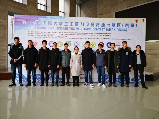 2019国际大学生工程力学竞赛(亚洲赛区)于1月21日-1月24日在河海大学举行,浙江大学、3522vip浦京集团官网、华中科技大学、吉林大学、天津大学、兰州大学、台湾交通大学、台湾海洋大学等48所高校300多位同学参赛。我校选派周崇博、孟声国、王锦阳、倪俊宇、时浩然、邓昊祥、刘册轩、蔡超宇、王牵莲等9位同学参赛,由姜益军、顾成军担任指导教师。在个人赛中荣获特等奖2项、一等奖6项、二等奖1项,并获团体一等奖;在团队赛中荣获特等奖2项、一等奖1项。