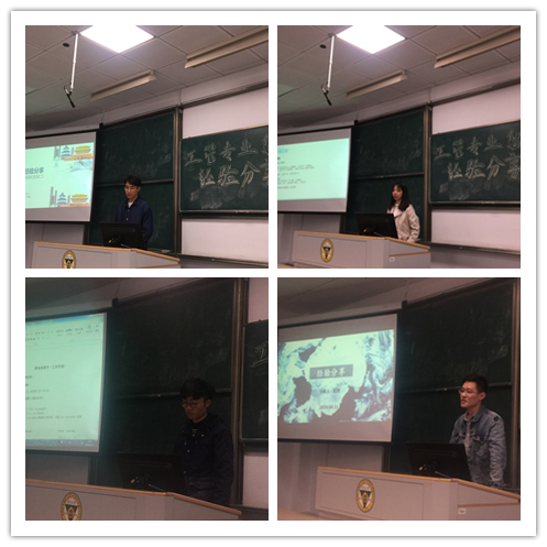 谭梓译同学目前已经拿到了新加坡国立大学、荷兰代尔夫特理工大学、荷兰埃因霍芬理工大学、英国大学学院和丹麦技术大学等多所世界名校的offer,他详细地讲述了留学申请遇到的问题、困惑以及自己的解决对策;杨雨同学目前已经拿到哥伦比亚大学、纽约大学、西北大学和伦敦大学学院等多所世界名校的offer,她同学们介绍了自己的申请经历,分享了自己的心路历程;已经决定去新加坡国立大学深造的唐茂宏同学详细介绍了新加坡国立大学和南洋理工大学两所世界名校工程管理专业的概况,以及自己选择新加坡国立大学的原因;程赟同学在介绍自己申请海外知名高校经历之余,还为正在准备期中考试的同学们提供了建议。