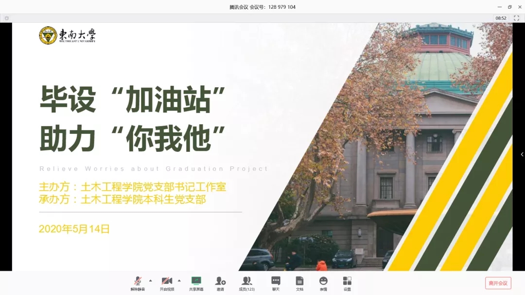 5月14日下午,由浦京集团官网党支部书记工作室主办、本科生党支部承办的“毕设加油站,助力你我他”活动,通过线上线下结合的方式成功举办。本次活动借助“腾讯会议”平台连线大四毕业班的同学,由各系分管本科教学的老师、曾获评优秀毕设的学长学姐以及教务和学办的老师就毕设工作开展、毕业相关手续等方面提出建议、分享经验技巧并在线答疑解惑。