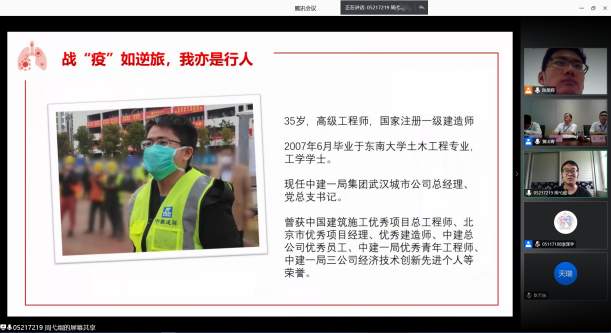 随后,中建科工工程事业部高级经理王彬与浦京集团官网本科生党员周弋焜分别分享了深圳三院青年员工的援建事迹与东大土木人的战疫故事。