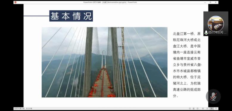 在7月19日举行的第一期分享会上,叶超同志从建设背景、工程概况和建设意义三个方面向大家介绍了昆明长水机场,随后刘应玺同志介绍了北盘江大桥的相关信息,他从大桥的基本情况、建设条件、桥型选择方案和主桥结构四个方面做了分享。
