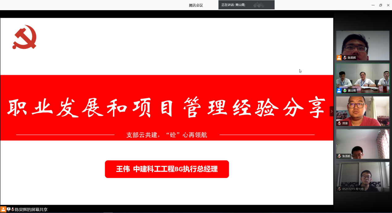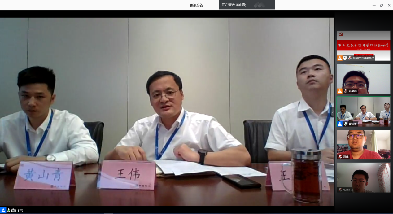 接下来,中建科工工程事业部执行总经理王伟向大家分享了职业发展和项目管理经验。王伟总介绍说,自大年初三接到深圳三院建设的通知,他感受到的是责任、担当和光荣。回顾建设过程,该项目极大考验了公司的EPC能力,全期共投入一万多名工人,建设零件离医院最近的距离只有45m,在这样危险的情况下保证施工进行和工人的安全,党支部发挥了重要的作用。党员干部深入一线,指挥项目操作,安排疫情防控。这一战凸显了中建科工的文化和党群组织的管理作用。