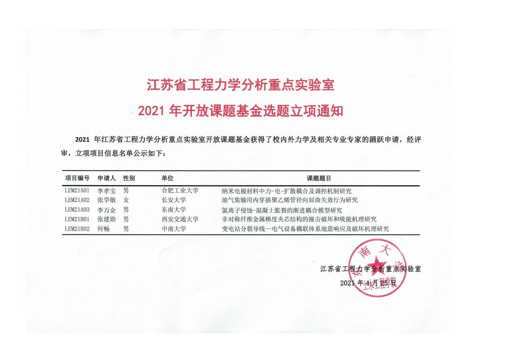 江苏省工程力学分析重点实验室2021年开放课题基金选题立项通知