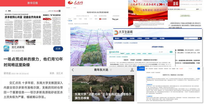 “点荒成林”水土流失治理与生态修复劳动育人实践项目以建立劳动教育实践基地为主要载体,搭建高校师生了解社情民情、参与劳动实践活动、投身国家建设的全新平台,探索形成校内课堂和社会课堂有机结合的劳动实践教育服务新模式。近五年,团队成员前往砒砂岩区、库布齐沙漠等进行开展生态修复与荒漠化治理的社会实践,利用W-OH材料对沙土进行固结,并通过植物配置与种植的具体劳动提高学生的动手能力,增强对专业的认识与理解。