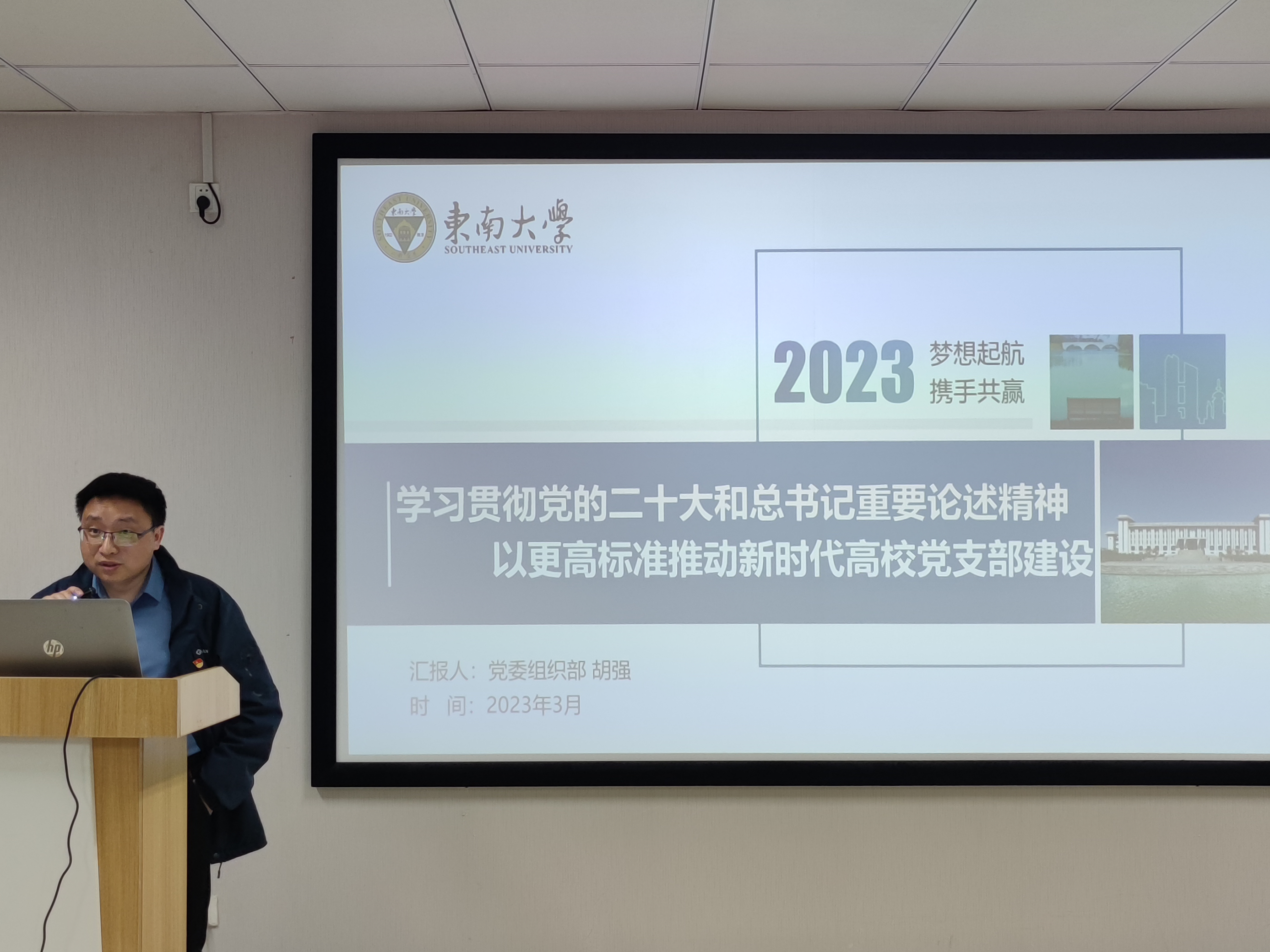 随后,校党委组织部胡强老师为大家带来了题为《学习贯彻党的二十大和总书记重要论述精神,以更高标准推动新时代高校党支部建设》的精彩讲座。会上,胡老师结合自身工作经历,与大家分享了 “支部设置标准化、组织生活正常化、管理服务精细化、工作制度体系化、阵地管理规范化”五个方面的内容。关于学习贯彻党的二十大和总书记重要论述精神,胡老师指出,要将目标放在以更高标准推动新时代高校党支部建设上去,深入领会支部在党的工作中的地位作用,深刻把握高校支部工作的任务要求,深化践行高校支部书记的使命担当,把学习成效转化为推动学校各项事业蓬勃发展的强大动力。此外,胡老师结合近日中共中央办公厅印发的《关于在全党大兴调查研究的工作方案》,提出新时代高校党支部书记应具备更高的素质和更科学的工作方法,在抓好支部建设、引领推动党和国家事业发展、助力中国特色世界一流大学建设等方面,发挥更大作用,作出更大贡献。