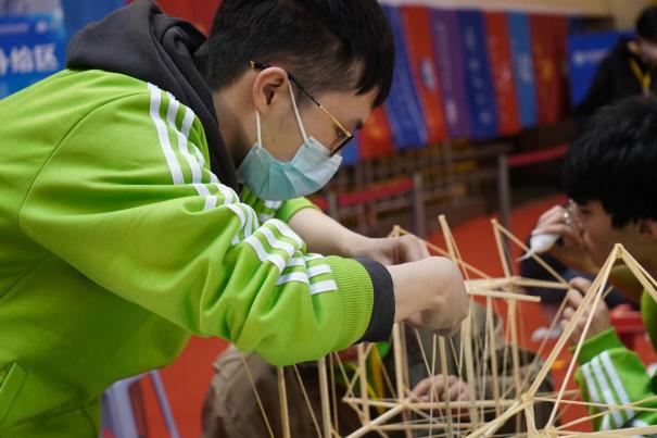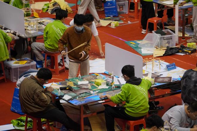本届赛题制作区域限制严格,模型构件数量多,制作复杂,备赛团队经历了近一年之久的长期备赛。参赛队员经过暑假留校的全力准备,代表我校参加省分区赛,在省赛中以一等奖第一名的成绩成功入围全国总决赛。省赛结束后,面对难度陡增的国赛赛题,备赛团队没有懈怠,立刻投入国赛的全力冲刺。一边是长期日夜颠倒备赛的体力挑战,一边是由于疫情比赛反复延期的精神考验,队员们始终没有放弃,对30万种复杂工况不断思索,对结构上的每一个构件进行微调优化,以求更轻的重量与在国赛中更强的竞争力。2023年2月,比赛时间终于敲定,在期末考试与比赛临近的双重压力下,备赛队经过慎重考虑,决定更换结构体系,选择更保守的四柱五层梁结构以及相对更轻的荷载。三月,全国110所高校的参赛队齐聚太原理工大学同台竞技,在16个小时的现场制作过程中,队员们沉着冷静的面对赛场上的各种问题,按计划完成了模型整体制作。然而其他队伍的荷载重量选取以及现场竞争的激烈程度超出了队员们的预料,为了挑战更好的成绩,队员们商讨决定选择此前考虑的最重荷载。最终,模型以较小的变形成功完成加载,斩获一等奖。