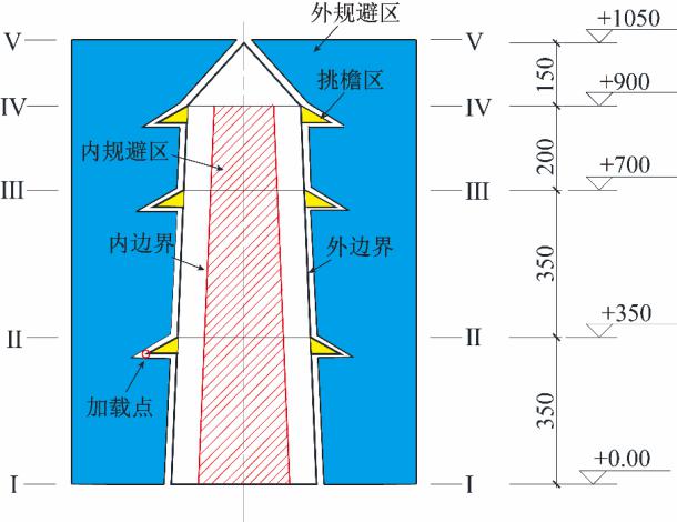 本次比赛以应县木塔为背景,要求制作一座三重木塔模型(以下简称“模型”),承受分散作用的竖向集中荷载、水平扭转荷载以及横向荷载,同时对模型的变形进行控制。模型整体高度限制在八边形外规避区及圆形内规避区之间,模型允许区域随高度上升而逐渐内缩,同时要求顶部进行装配式设计。加载点设置在挑檐区,加载共分为三级,对应竖向、扭转、水平荷载。