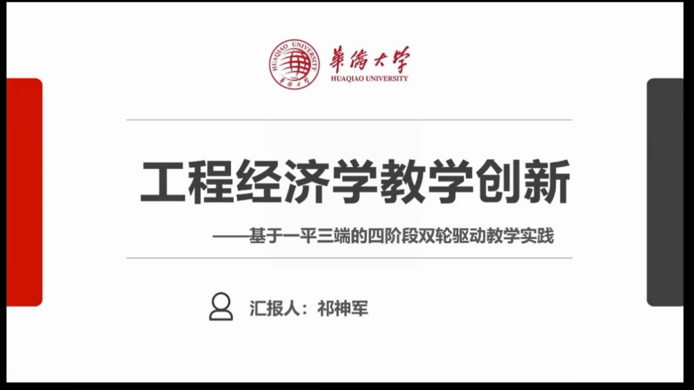 随后,福建省土木建造与管理课程群慕课应用教学团队负责人祁神军副教授从课程建设发展历程、教学创新、创新支撑、创新成效四个方面介绍了基于“一平三端”的“四阶段双轮驱动”混合式教学的建设情况。《工程经济学》课程持续建设需要教学内容和教学方法的创新支撑,应主动融入课程思政元素,并有效使用信息化工具。
