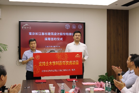 在捐赠环节,南京长江都市建筑设计股份有限公司党委书记、副总经理徐澄与3522vip浦京集团官网发展委员会副主任、教育基金会秘书长芮振华签署捐赠协议。芮振华主任代表学校接受捐赠并向徐澄书记颁发捐赠证书,赠送捐赠纪念盘。