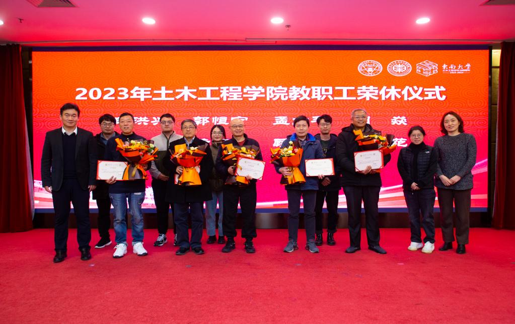 随后学院为即将退休的教师举办了荣休仪式。党委书记刘静和院长郭彤为李维滨、顾成军、黄有亮、陈忠范、郭恒宁共五位老师颁发荣休证书,感谢他们为东南土木学子的成长成才的长期坚守、默默付出与保驾护航。