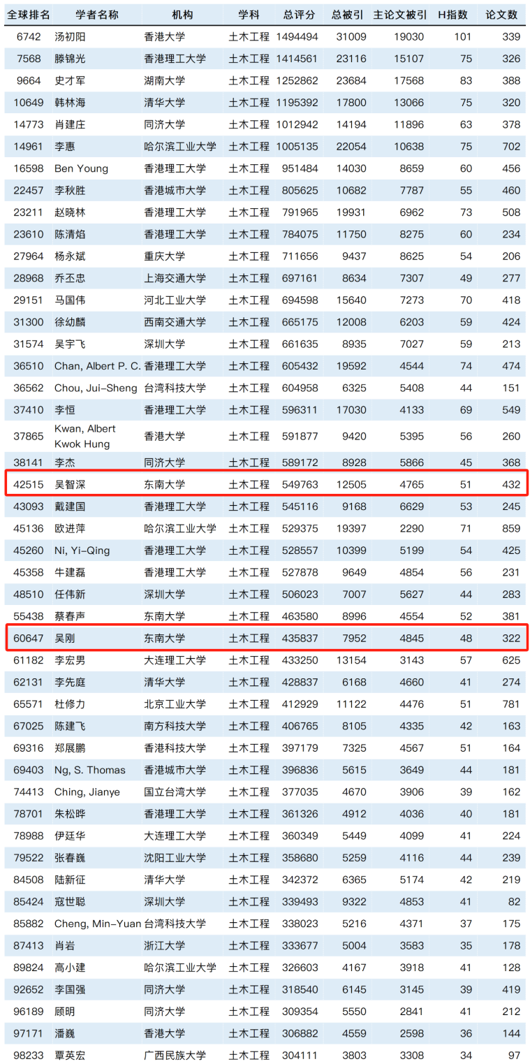近期,国内全球学者库网站公布了“2023全球学者学术影响力排名(终身学术影响力榜)”,依照学者科研产出、Google Scholar Metrics 期刊评分、H指数、成果被引、成果中作者排序位置等参数综合考虑的结果。平均分高表明学者更倾向于在高质量期刊发表文献,综合评分则更多考虑学者的产出量。该名单中国内共有8029人入围,其中土木工程学科47人(内地学者29人),我校共有3位教授入选,其中浦京集团官网吴智深教授和吴刚教授入选,具体名单如下: