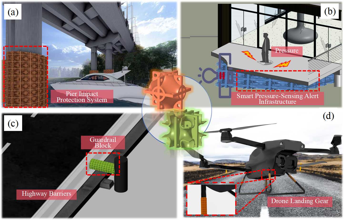 该策略具有良好的拓展性,可适用于多种异构拓扑组合设计,在土木工程与结构工程多个重要领域提供了高度定制化、高性能与功能一体化的超材料解决方案,具体包括智能传感基础设施、抗冲击结构、缓冲防护装置及无人机软着陆系统等,未来在土木工程、机械工程、航空航天、生物医学等多学科交叉领域应用前景广阔。