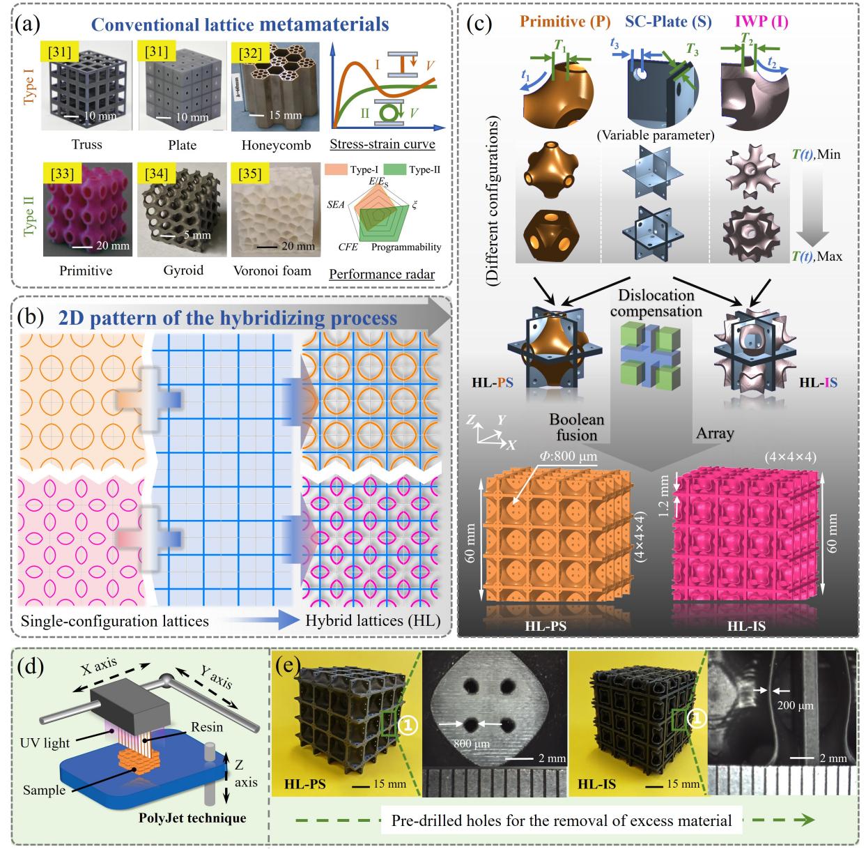 针对超材料在刚度与可调性之间难以兼顾的固有矛盾,以及制造过程中易出现缺陷等制约其工程应用的瓶颈问题,研究团队立足土木工程前沿交叉领域,创新性地提出了一种通用的空间补偿-布尔融合设计框架。通过将三周期极小曲面(TPMS)与简单立方(SC)板晶格一体化集成,成功研制出具备高度可调性的高性能杂化晶格超材料。采用PolyJet打印技术实现了样品的高几何保真度制造,并通过均质化方法、准静态压缩测试和有限元模拟进行了系统评估。相较于传统超刚强晶格,该新型超材料有效弹性模量可调范围大幅提升213.98%,杨氏模量最高突破Hashin-Shtrikman理论上限的137.34%,能量吸收能力较单一组分总和提升30.16%,充分验证了其优异的塑性变形能力和能量吸收效率,应用于需应对抗冲击与振动控制等严峻挑战的极端环境重大工程。