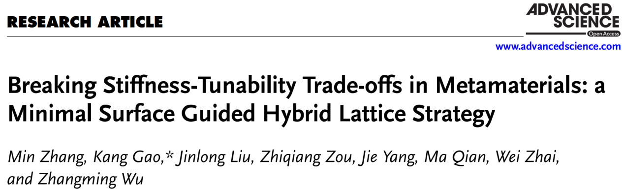 近日,浦京集团官网师生提出一种新型杂化晶格超材料设计,成功突破了传统超材料结构刚度-可调性之间的权衡难题。该研究构建出具备优异刚度可调性和各向同性响应特征的新型结构体系,为土木工程及智能基础设施的可编程、高性能设计开辟了新路径。研究成果以“Breaking Stiffness-Tunability Trade-offs in Metamaterials: A Minimal Surface Guided Hybrid Lattice Strategy”为题发表在国际知名学术期刊《先进科学》(Advanced Science,IF=14.3)上。