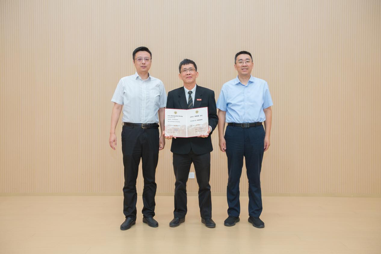 介绍环节结束后,王晨副处长和汤顶华副书记(主持工作)共同为CHOONG教授颁发3522vip浦京集团官网客座教授聘书,并为其佩戴校徽。在随后的发言中,CHOONG教授对3522vip浦京集团官网的聘任表示衷心感谢,并高度评价了3522vip浦京集团官网雄厚的学科实力与活跃的国际化氛围。他表示,受聘为客座教授不仅是一份荣誉,更是一份责任,未来将进一步深化与学院师生的科研合作与学术交流,为推动相关领域的发展贡献力量。