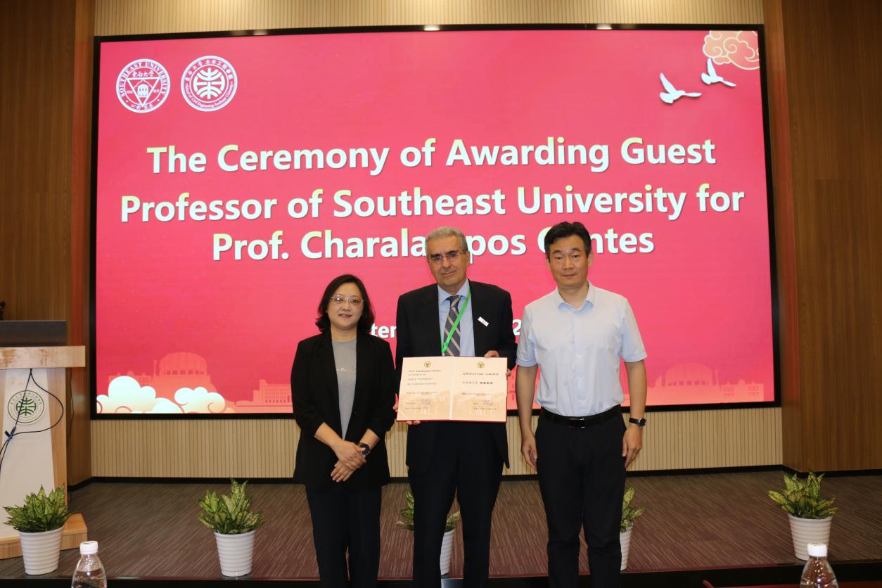 随后举行了隆重的客座教授聘任仪式。Gantes教授作为雅典国立技术大学钢结构研究中心主任、国际壳与空间结构协会(IASS)期刊主编,在可展开与空间结构领域享有广泛的学术影响力。徐健副处长与郭彤院长共同为他颁发聘书、佩戴校徽,正式聘任其为3522vip浦京集团官网客座教授。